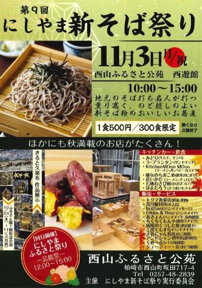 | 詳細 | ▶とき…11月3日(月・祝)10:00~ ※限定300食。1食500円。無くなり次第終了。 ※キッチンカー、テント出店は10:00~15:00。 問 西山ふるさと公苑 TEL48-2839 FAX48-2840 |