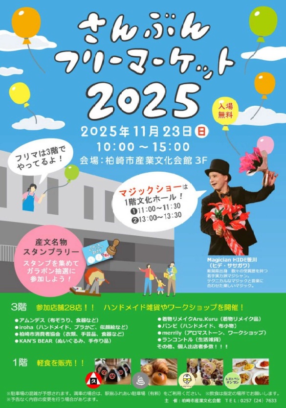 | 詳細 | ▶内容…館内でフリーマーケットやワークショップを開催します。親子で楽しめる内容です。 HIDE 笹川によるマジックショー ① 11:00 ~ 11:30 ② 13:00 ~ 13:30 詳しくはホームページをご覧ください。 問 産業文化会館24-763322-7721 |