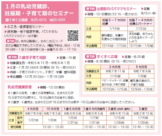 「出産前のパパママセミナー」「すくすく広場」「2歳児子育て相談」は予約が必要です。