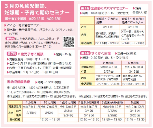3月の乳幼児健診、妊娠期・子育て期のセミナーのお知らせ(一部要予約)