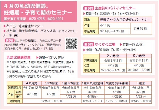 4月の乳幼児健診、妊娠期・子育て期のセミナーのお知らせ(一部要予約)