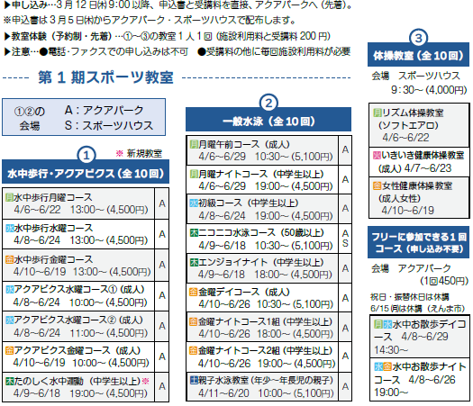 アクアパークの教室(2026.4~6月) 2026年03月13日掲載 ▶申し込み…3月12日(木)9:00以降、申込書と受講料を直接、アクアパークへ(先着)。※申込書は3月5日(木)からアクアパーク・スポーツハウスで配布します。▶教室体験(予約制・先着)…①~③の教室1人1回(施設利用料と受講料200円)▶注意…◦電話・ファクスでの申し込みは不可◦受講料の他に毎回施設利用料が必要問 アクアパーク TEL22-5555 FAX22-0766